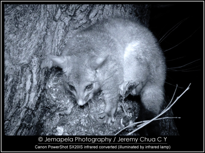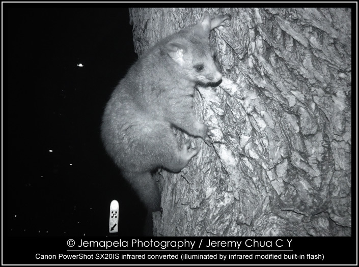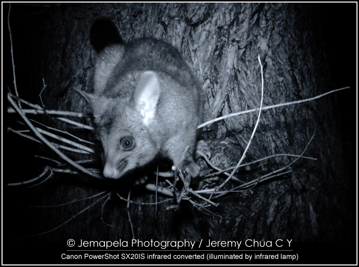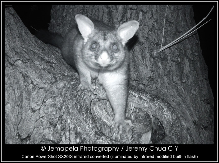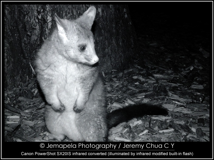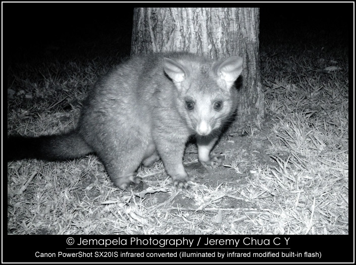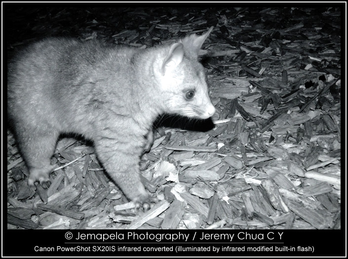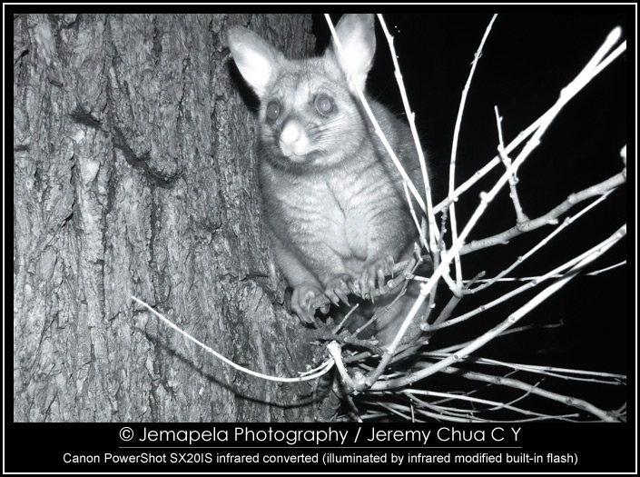 In late 2012 to early 2013, I modified a Canon PowerShot SX20IS to be IR sensitive, and also modified its built-in flash to emit IR. I also modified a small LED lamp by replacing its white light LEDs with specially selected IR light LEDs. Together with this small modified LED lamp, I used the camera to photograph Australian wildlife, the common possums, at a public park in Melbourne CBD.